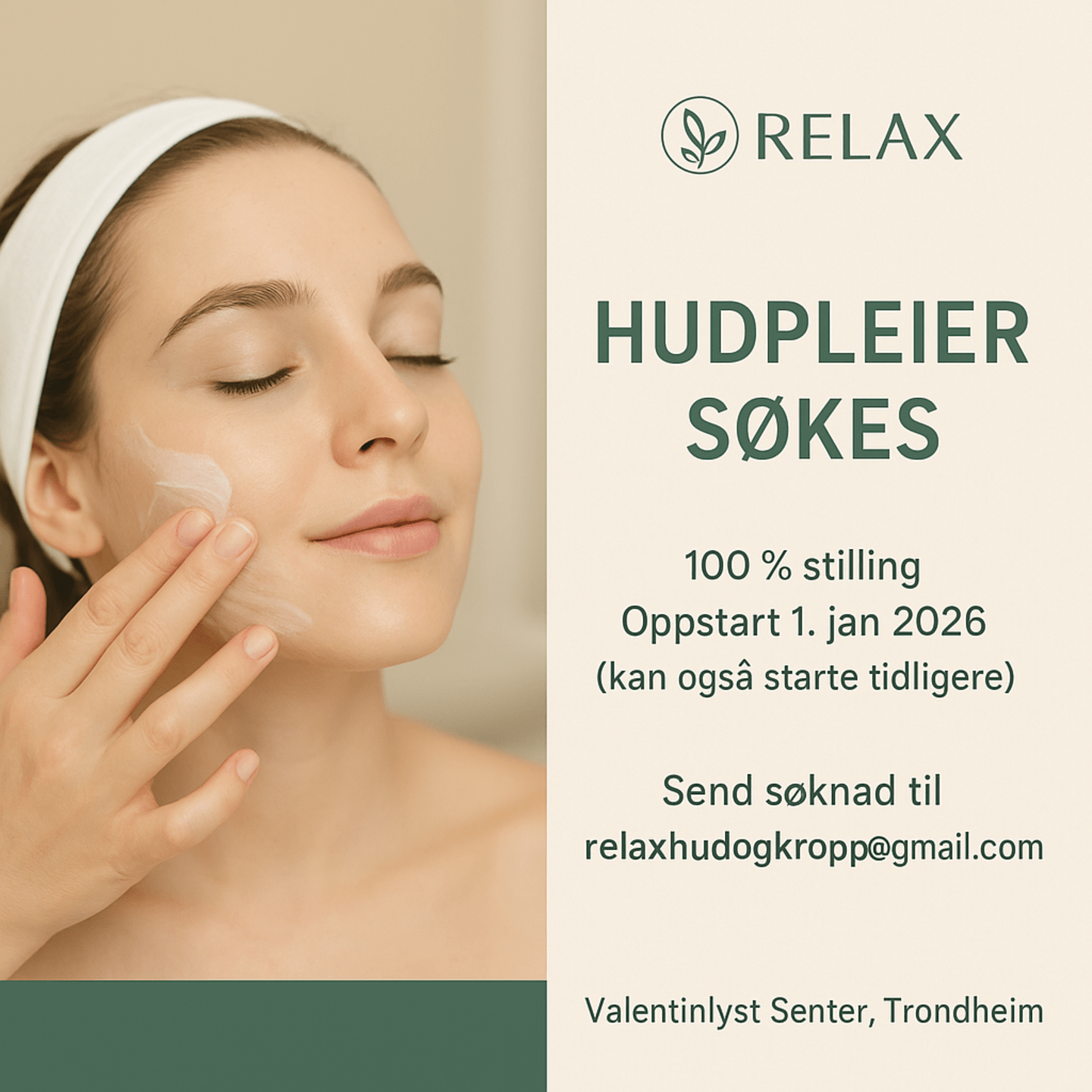 Vi søker deg som: Brenner for faget og yrket – viser engasjement og stolthet i arbeidet. Serviceinnstilt og imøtekommende – setter alltid kunden i fokus. Trygg og profesjonell – evner å skape tillit og ro i behandlingssituasjoner. Samarbeidsvillig – liker å jobbe i team, men kan også arbeide selvstendig. Nøyaktig og kvalitetsbevisst – har øye for detaljer og leverer høy standard. Lærevillig og utviklingsorientert – ønsker å holde seg oppdatert på trender og nye metoder. Fleksibel – kan tilpasse seg kundens behov og hektiske perioder. Send søknad/cv til relaxhudogkropp@gmail.com